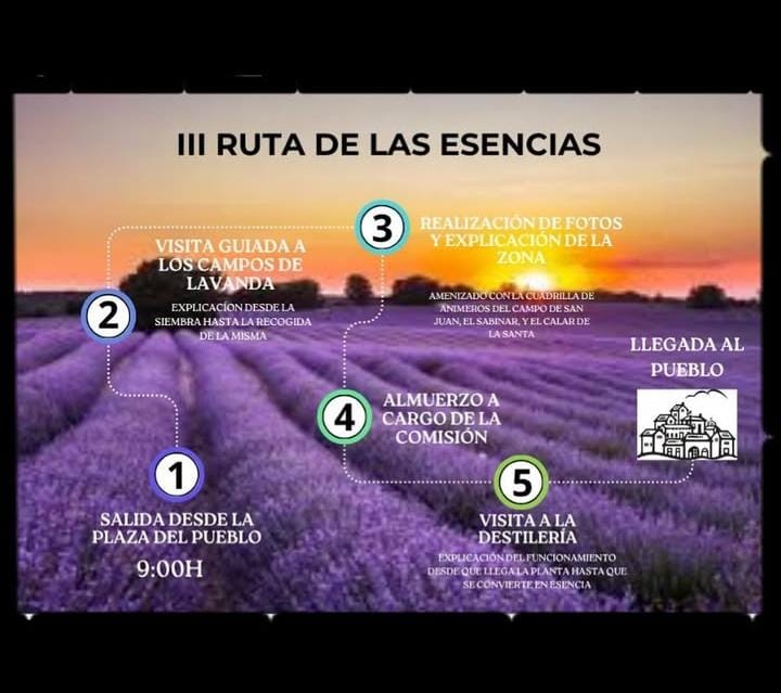 La jornada comenzó con una ruta a pie de 2 km por los campos de lavanda, donde se ofreció una detallada explicación técnica sobre el cultivo de esta planta aromática. Se abordaron aspec-tos clave del proceso productivo, desde la preparación del terreno y la siembra, pasando por el manejo agronómico (control de malas hierbas, riego y abonado), hasta la recolección de la lavanda en su estado óptimo.